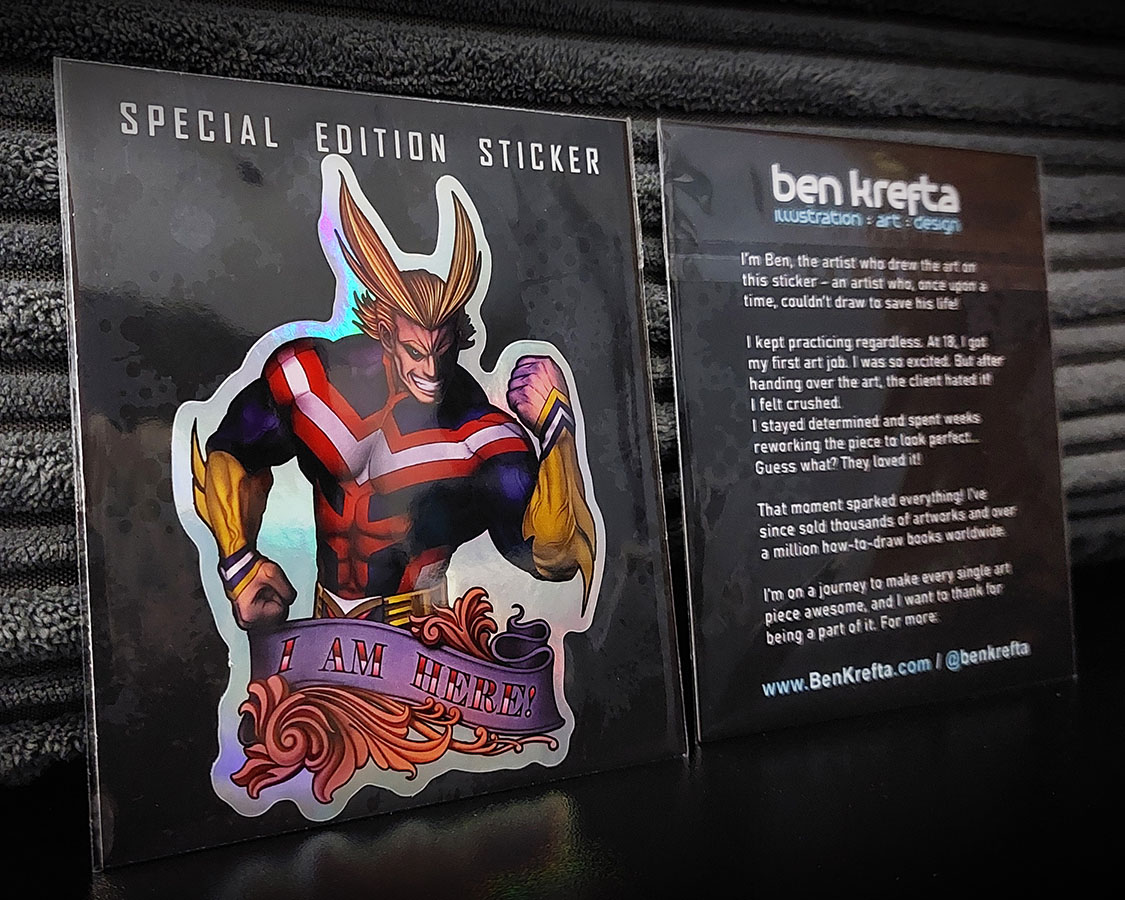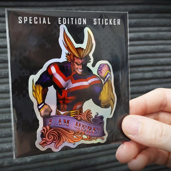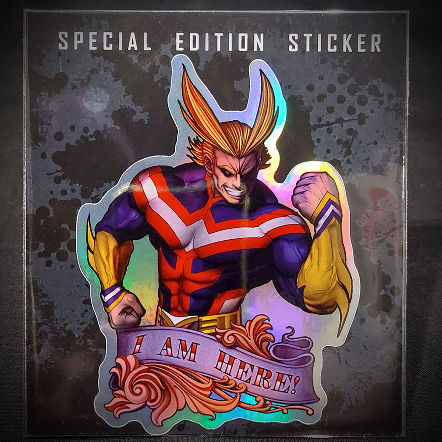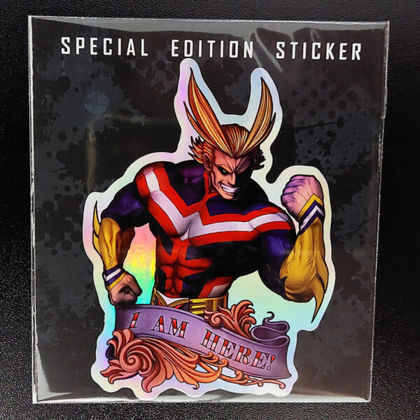 Symbol of peace. Beacon of hope. This sticker captures All Might at his most iconic—grinning with confidence, radiating heroic energy, and declaring his legendary catchphrase: “I am here!” With his bold stance and unmistakable presence, the artwork channels the explosive spirit of My Hero Academia. Every muscle, shadow, and line is rendered with dynamic force, celebrating the strength and optimism that define him. Whether you admire him as a mentor, hero, or symbol of justice, this is a striking tribute to anime’s ultimate protector. Ideal for fans who believe in standing tall when it counts.