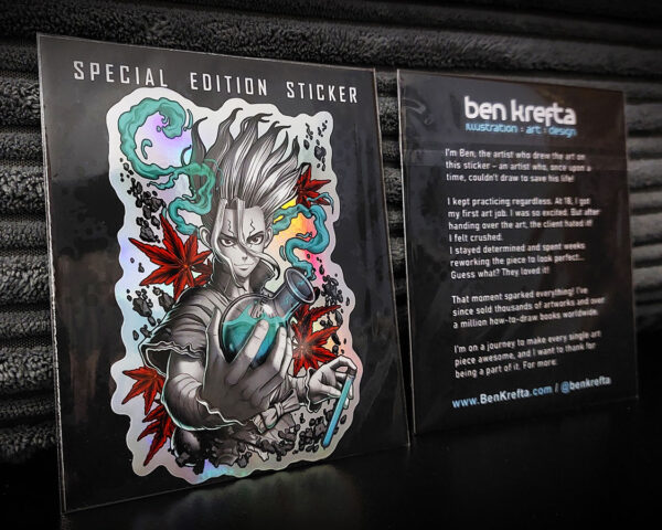 This illustrated anime inspired sticker is created by Ben Krefta- A professional artist best known for his ‘How to Draw Manga’ art books, which have sold over 1 million copies globally. He specialises in manga, comic and tattoo inspired designs and art.