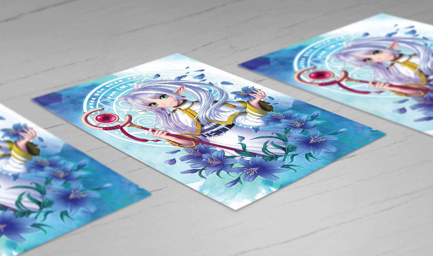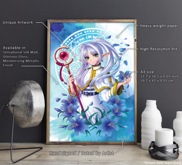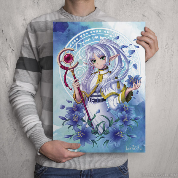The kawaii Frieren print with its calming blue tones and delicate flowers is a delightful addition to my bedroom. It brings a sense of peace and whimsy that brightens my day.