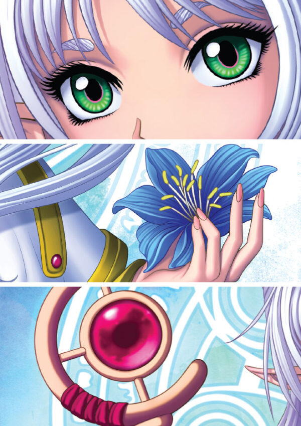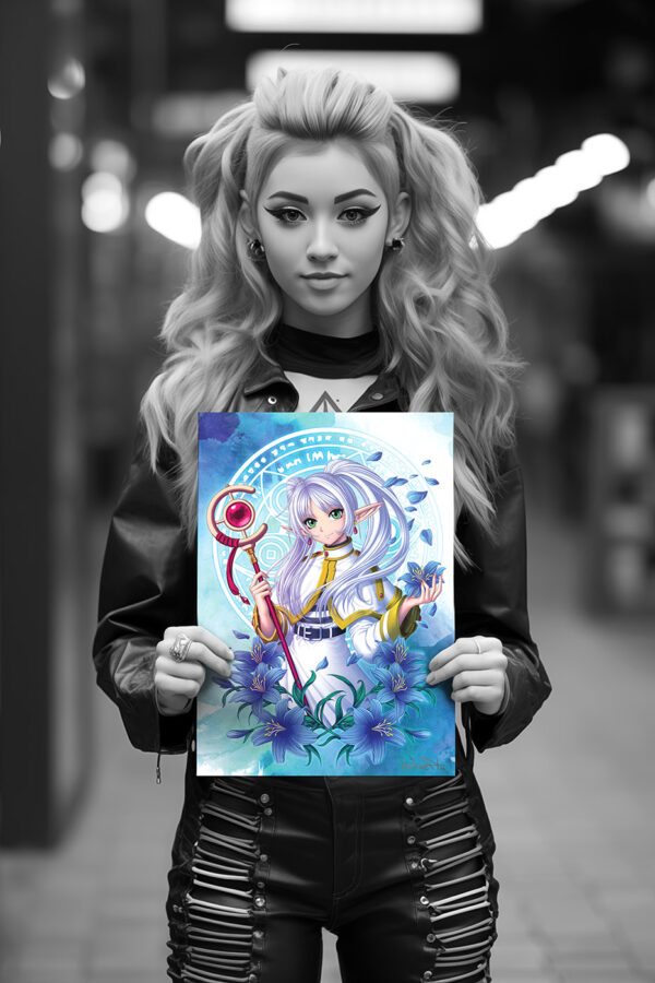 Frieren, an ageless elf, wandered the realms with a serene grace born of centuries of wisdom. In her ethereal presence, time seemed to stand still, the echoes of bygone eras whispering in her wake. Though burdened with the weight of immortality, she embraced each passing season with a gentle resilience, her compassion a beacon of light in a world shrouded in darkness. She loves flowers. The rare blue blooms with their delicate petals a testament to her new found reverence for life’s fleeting beauty.