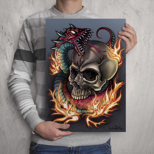 Skull and Snake. This illustrated art print is created by Ben Krefta- A professional artist best known for his ‘How to Draw Manga’ art books, which have sold over 1 million copies globally. He specialises in manga, comic and tattoo inspired designs and art.