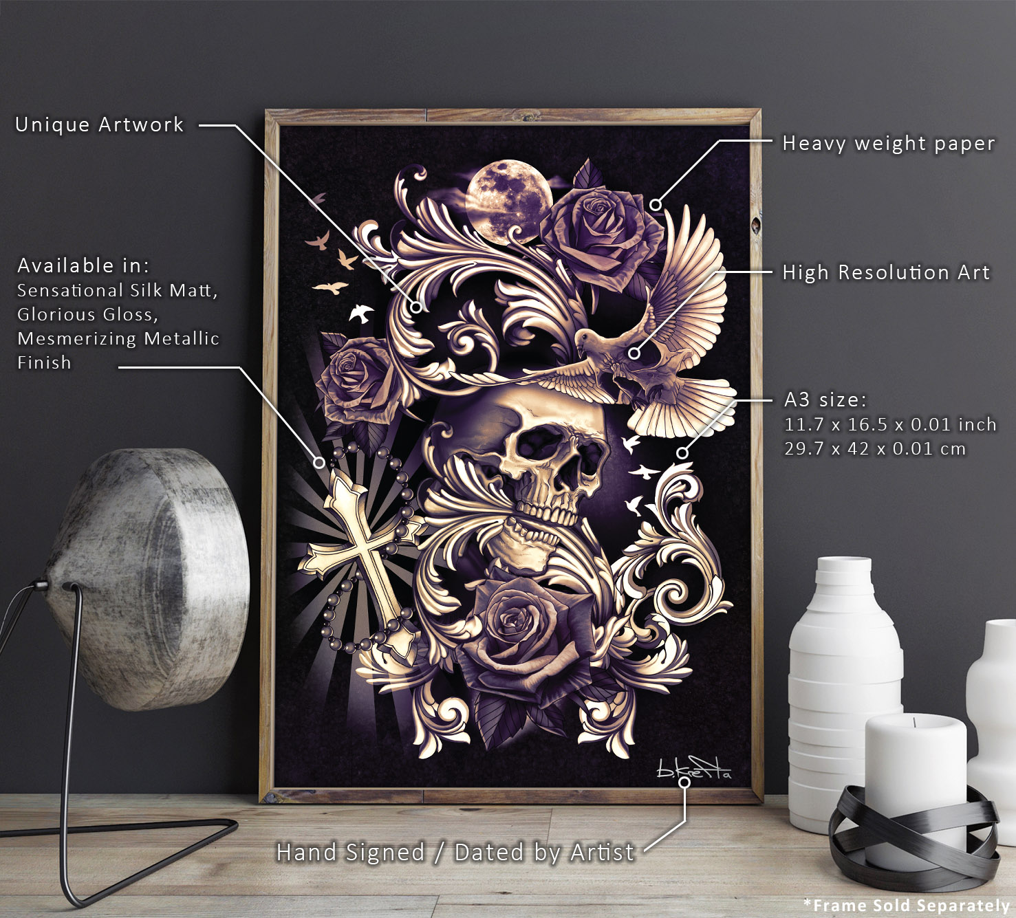 Skull and Dove with Roses and Filigree. This illustrated art print is created by Ben Krefta- A professional artist best known for his ‘How to Draw Manga’ art books, which have sold over 1 million copies globally. He specialises in manga, comic and tattoo inspired designs and art.